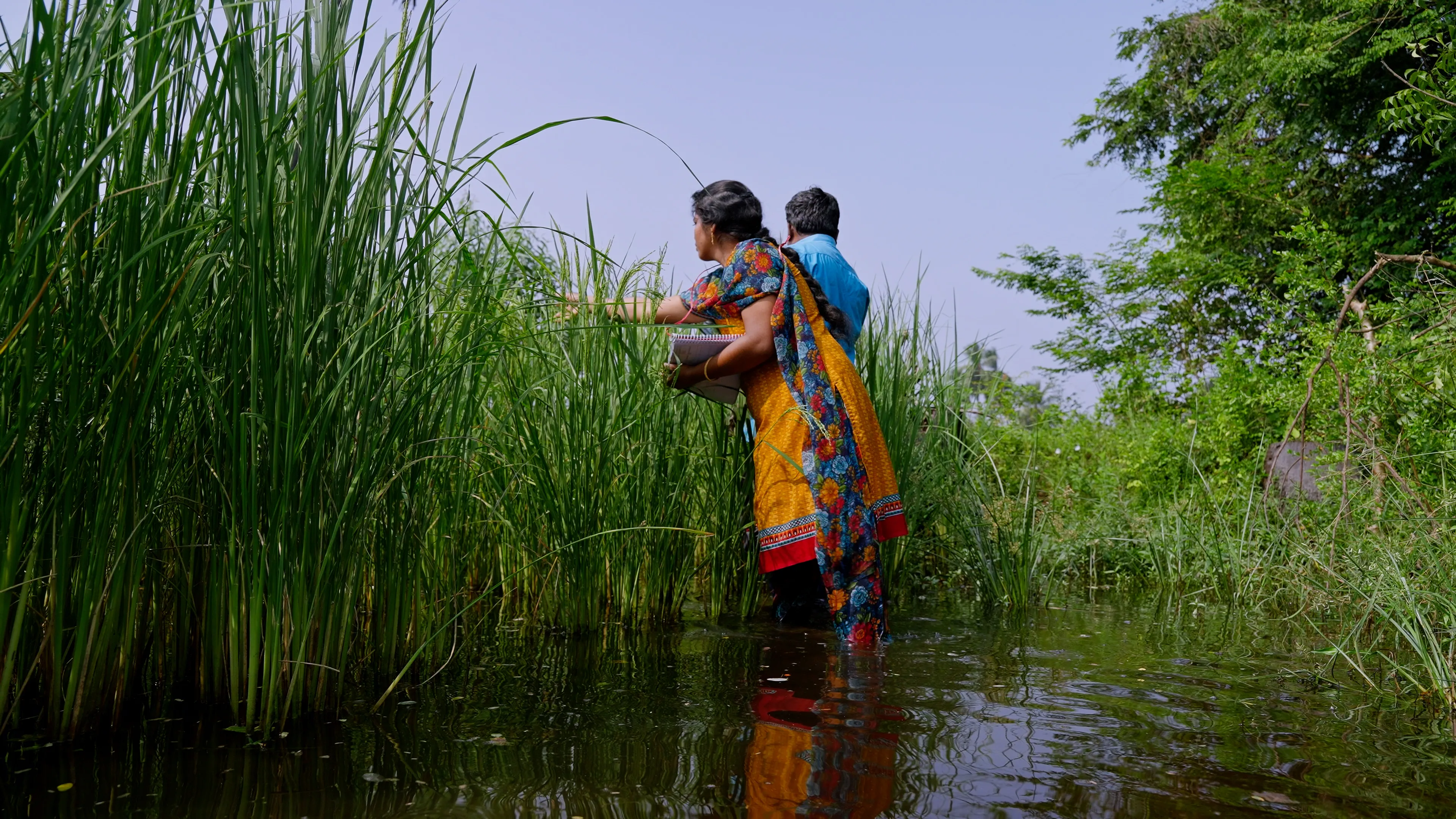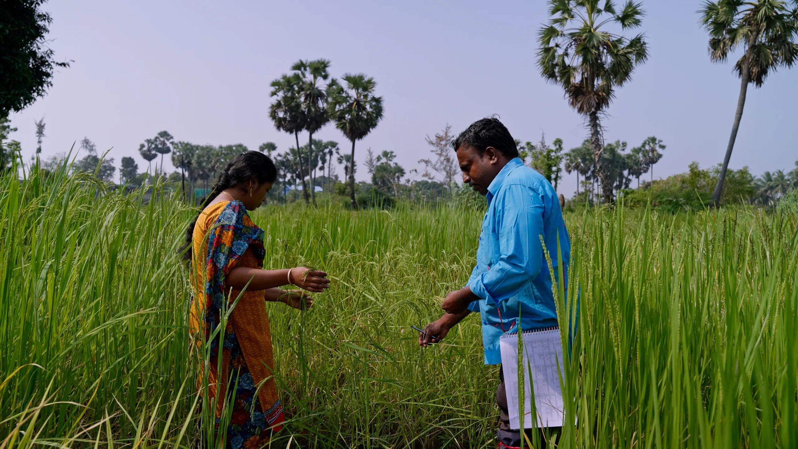 On a bright January morning in Tamil Nadu’s Kuravapulam village, Sivaranjini S. closes the door to her kitchen, picks up a spiral-bound notebook, and walks into the paddy fields adjacent to her home. Her husband, Saravanakumaran P., follows her into the fields, adjusting his blue rubber boots as he walks past a line of palm trees that mark the boundary of their land.