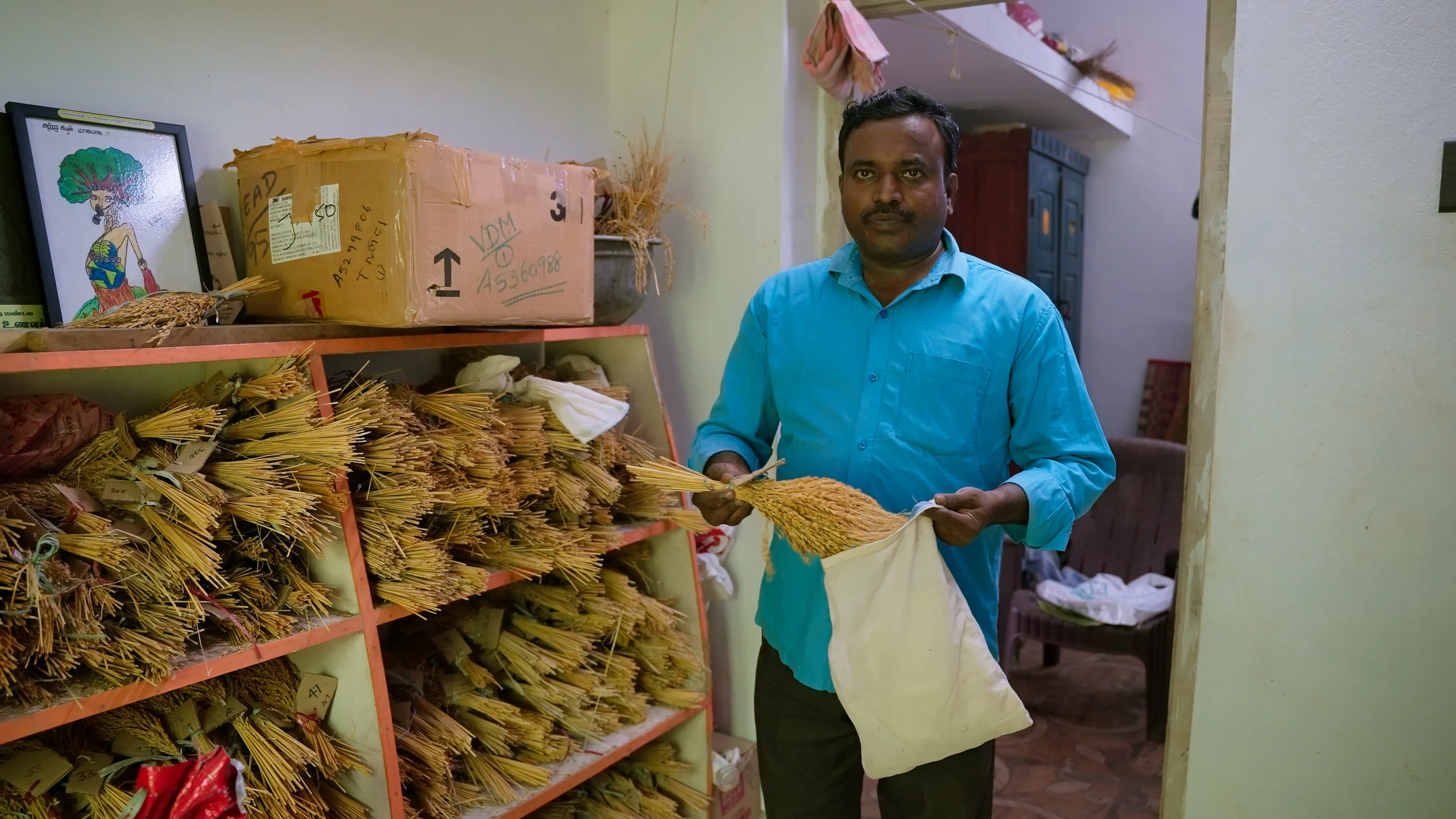 After harvest, seeds destined for the seed bank are carefully sun-dried. Each variety is assigned a tag with a unique number, which is then recorded alongside its name in the family’s meticulous archive. The tagged bunches are carefully packed into white cloth bags and stored in a well-ventilated room. On every new moon day, the seeds are brought out and sun-dried between 9 am and 11 am to maintain the right moisture balance and preserve their germination capacity. “The work is painstaking and repetitive, closer to archival curation than routine farming,” adds Sivaranjini.