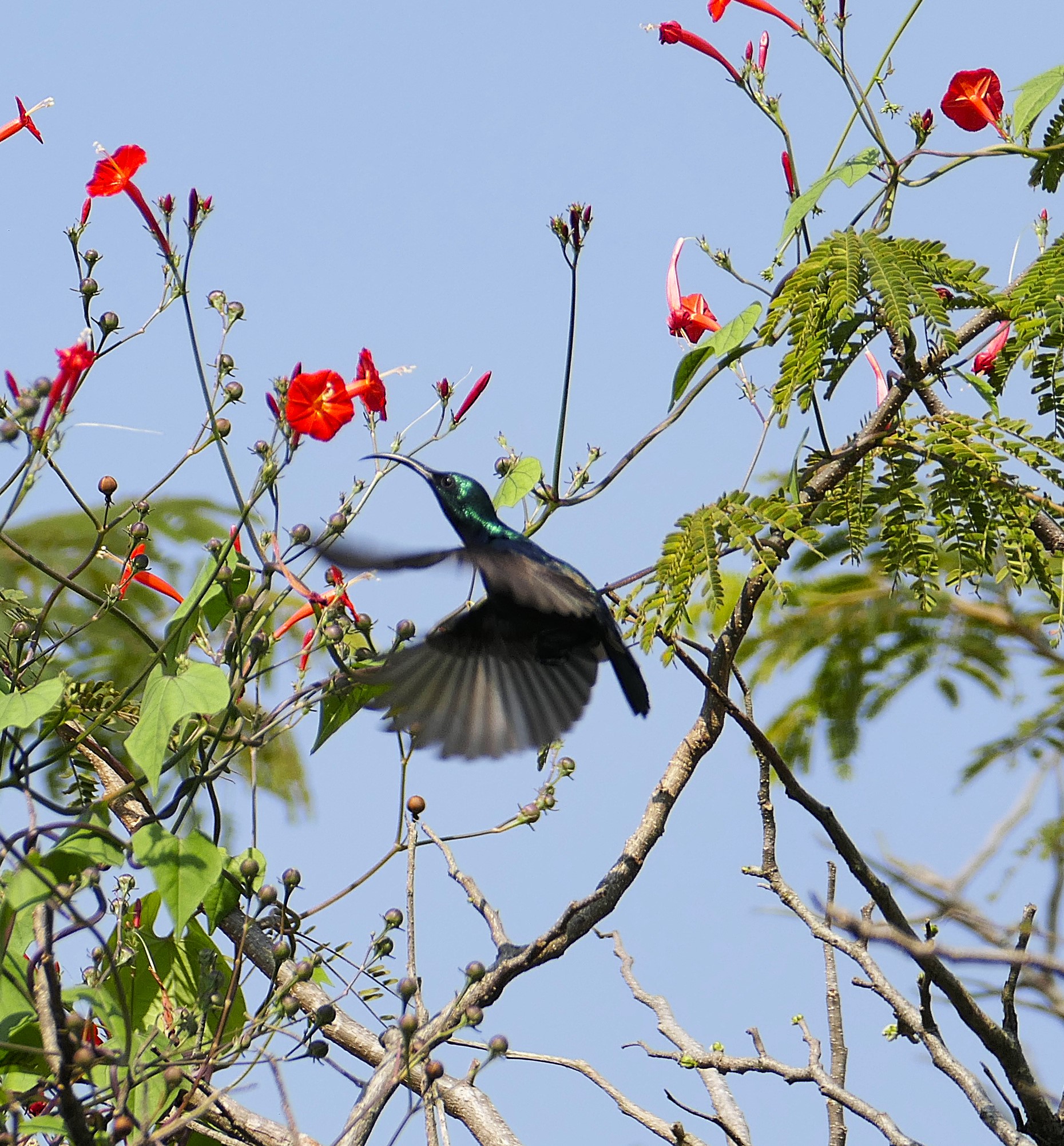 Along with nectar-rich flowering plants like Hibiscus, Moringa, and Hummingbird trees came sunbirds. They are important pollinators of not only agricultural crops, but wild indigenous plants, too, like the East-Indian screw tree (Helicteres isora), dispersing seeds in the process. Mutualism between frugivores (fruit-eating birds and plants), such as the association between Bulbuls and Jyotishmati (Celastrus paniculatus), lies at the basis of eco-restoration. A decade ago, there was just a single gnarled liana of Jyotishmati, valued greatly in Ayurveda for its medicinal properties. Today, there are several in various stages of growth, in different locations. We might credit Bulbuls, which eat the scarlet fruits, for having fulfilled their role well as seed dispersers.