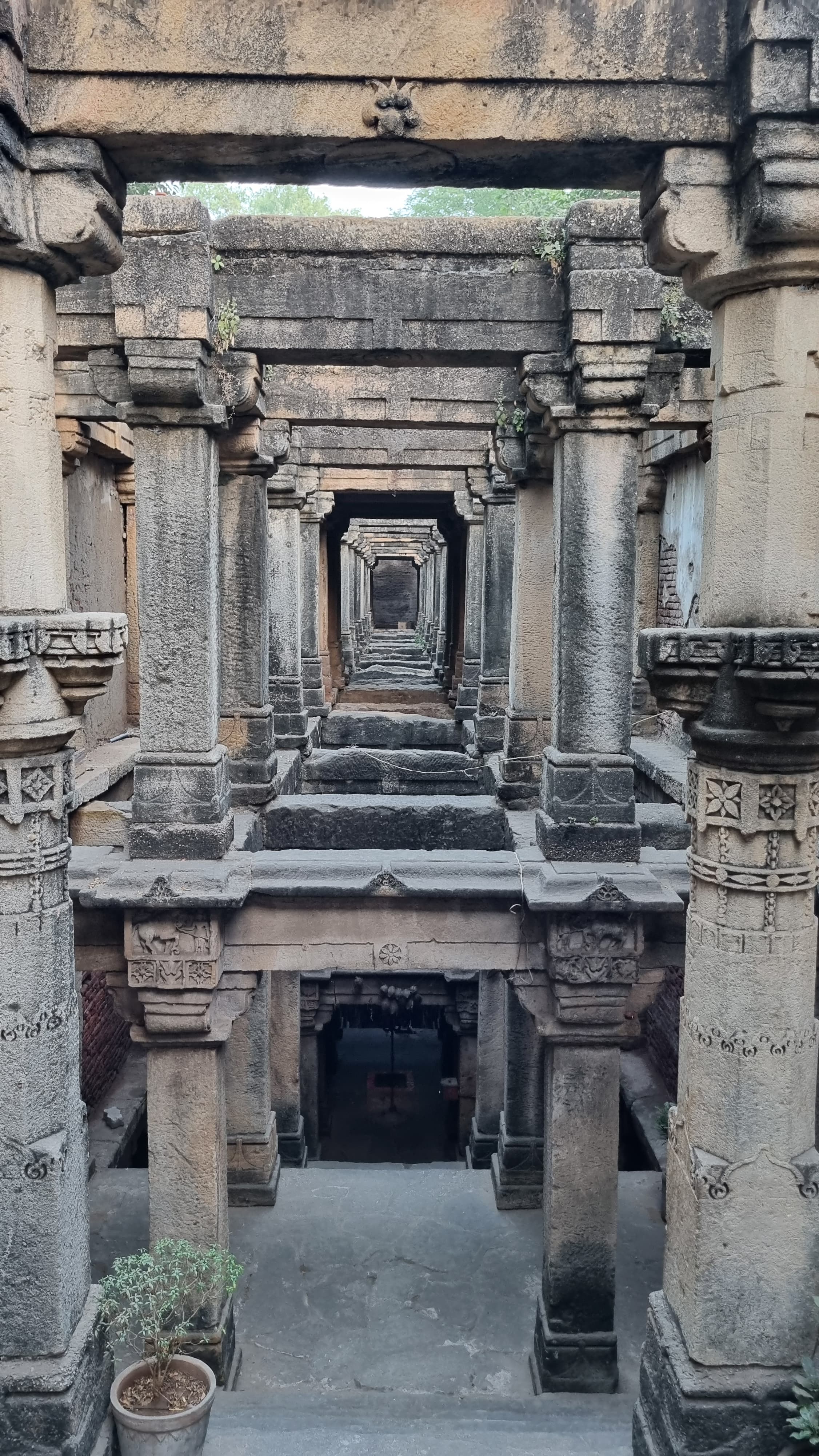 A dome (gumbad) adorned with intricate carvings and a parapet gives way to a water reservoir that seems to emerge from the depths of the earth. Multi-layered with stories that run deep and columns that create a hypnotic illusion of windows within windows, these structures appear as if the building had been uprooted and turned upside-down, tucked comfortably inside the earth. They break away from architectural archetypes in an attempt to create a subversion of design penetrating the very ground beneath our feet. The temperature drops dramatically as you descend the steps. The air grows heavy with moisture, its traces visible in the moss-ridden brick and mortar—a microclimate preserved within these ancient walls that tells the story of Gujarat's enduring relationship with water conservation.